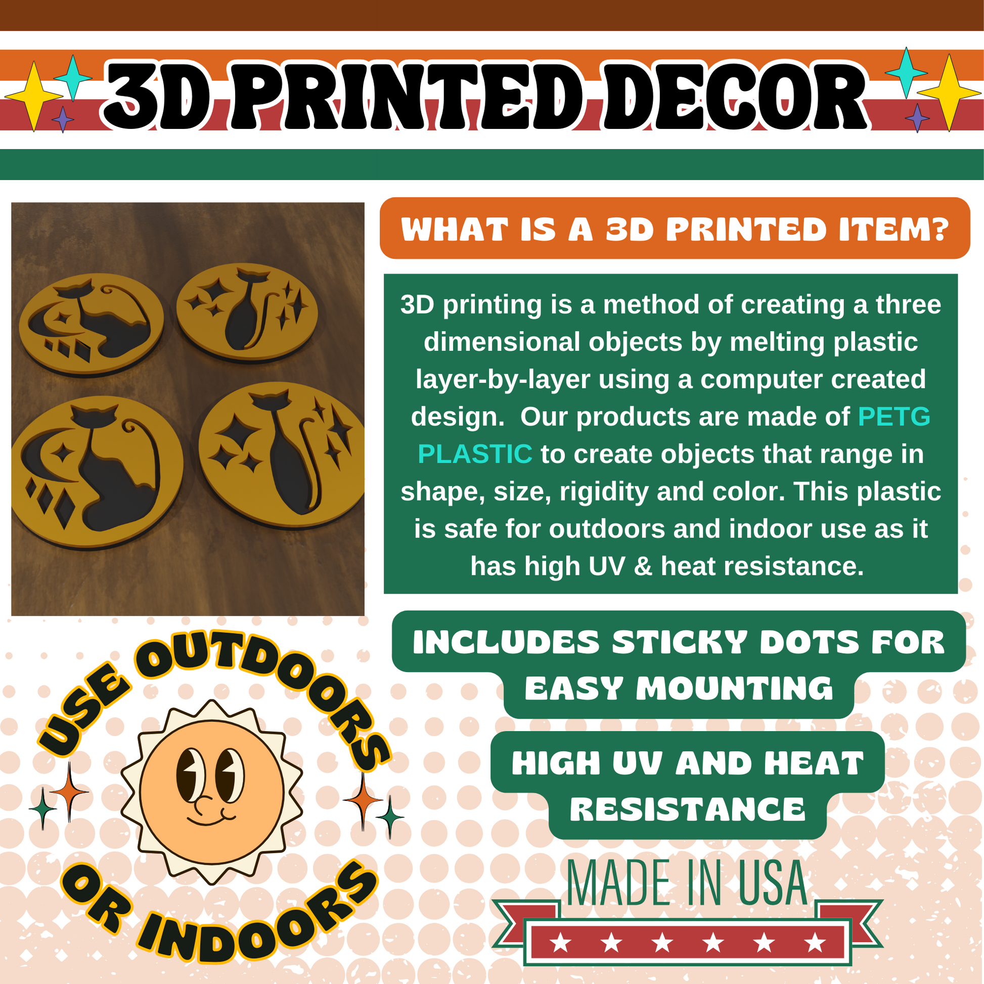 Hey Cool Cats & Kittens! Explore these exquisite Mid Century Modern coasters crafted through state-of-the-art 3D printing techniques. Elevate the ambiance of your trendy abode with these remarkable additions. Our collection boasts a spectrum of distinctive colors, allowing you to curate the perfect match for your personal aura. The coasters are meticulously handcrafted from premium PETG plastic, a thermoplastic renowned for its safety and versatility in both indoor and outdoor settings. Its exceptional resistance to high temperatures and UV rays ensures enduring charm and functionality.