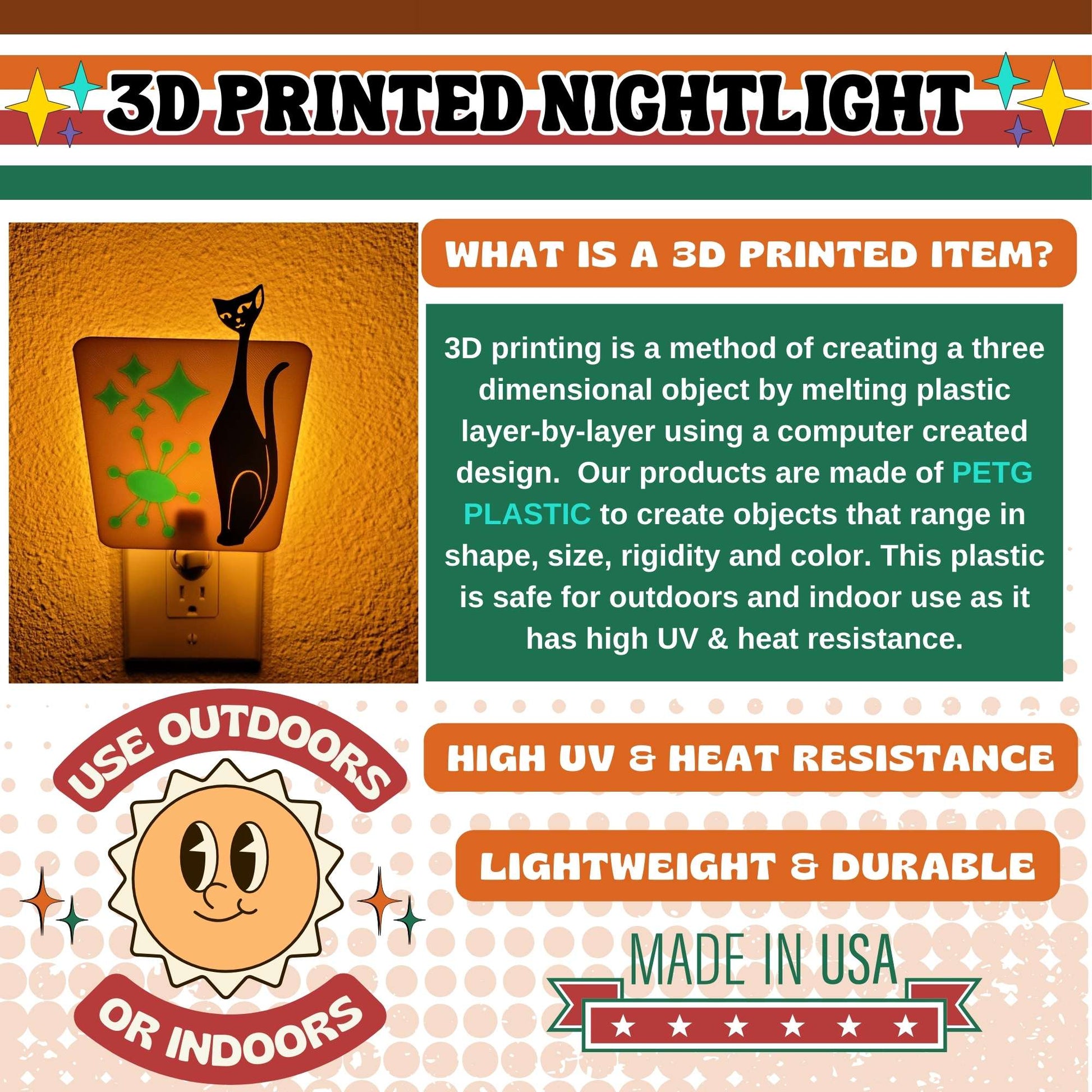 Introducing our latest creation: the Galactic Feline Illuminator! 🌟 Warm Up your space with this Atomic Cat Night Light, meticulously crafted using top-quality PETG plastic through advanced 3D printing technology. Lightweight yet durable, it effortlessly complements your décor while adding a touch of whimsy.