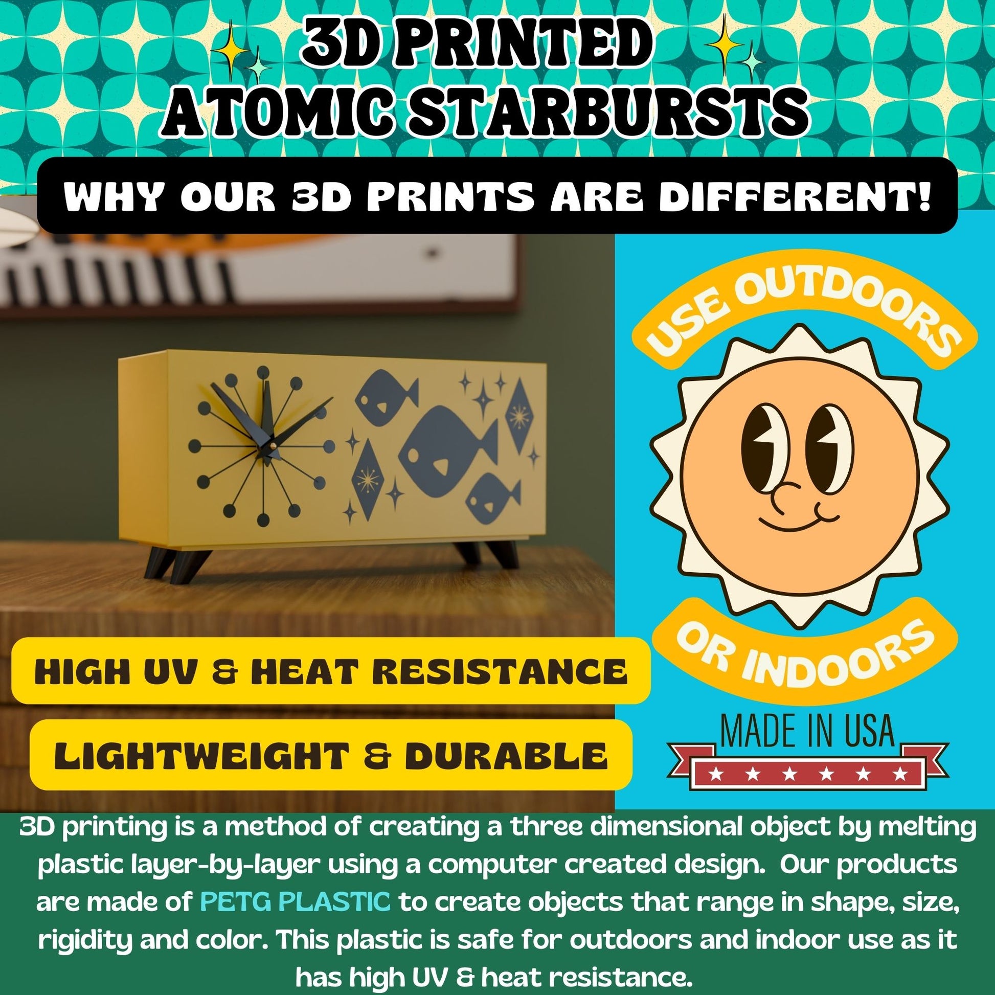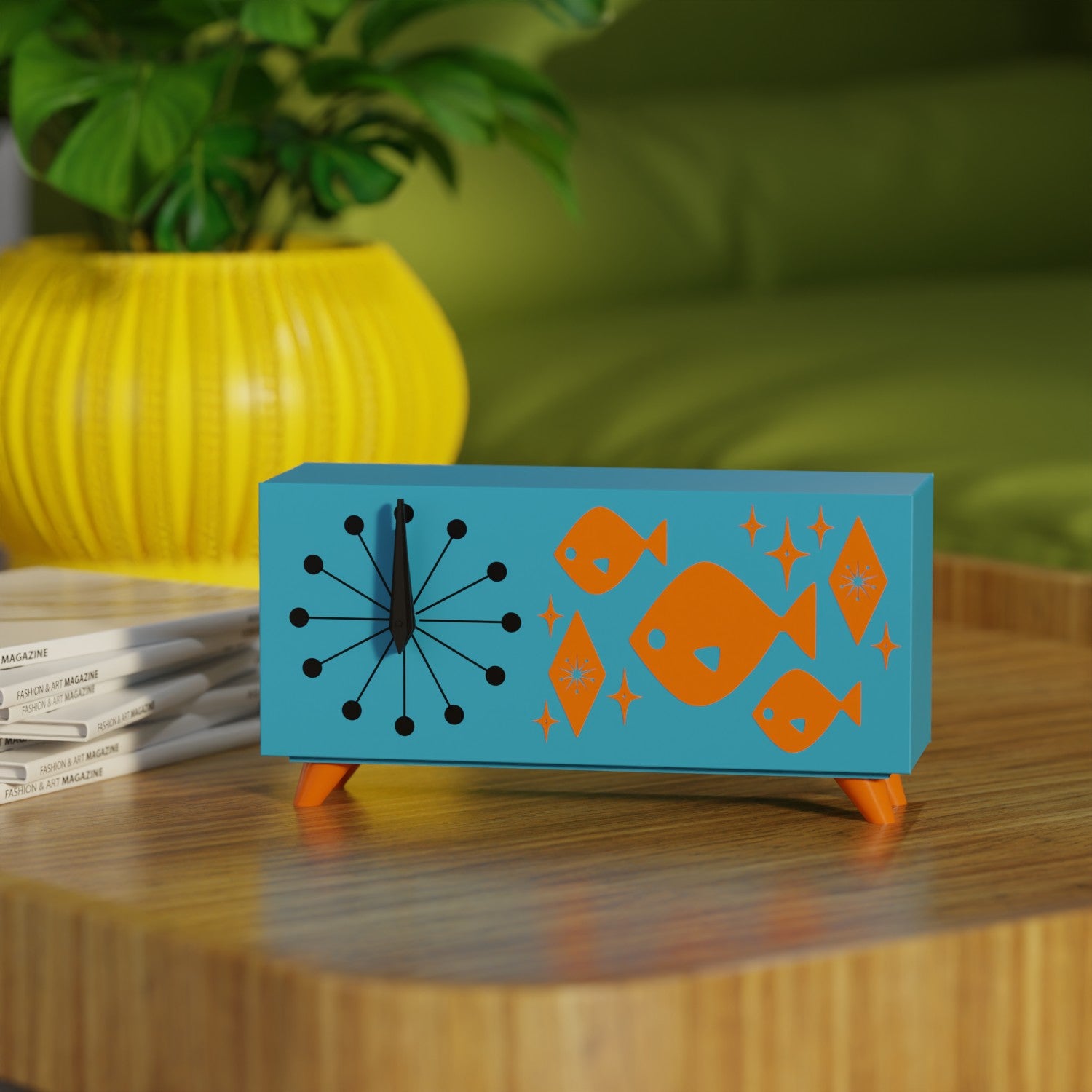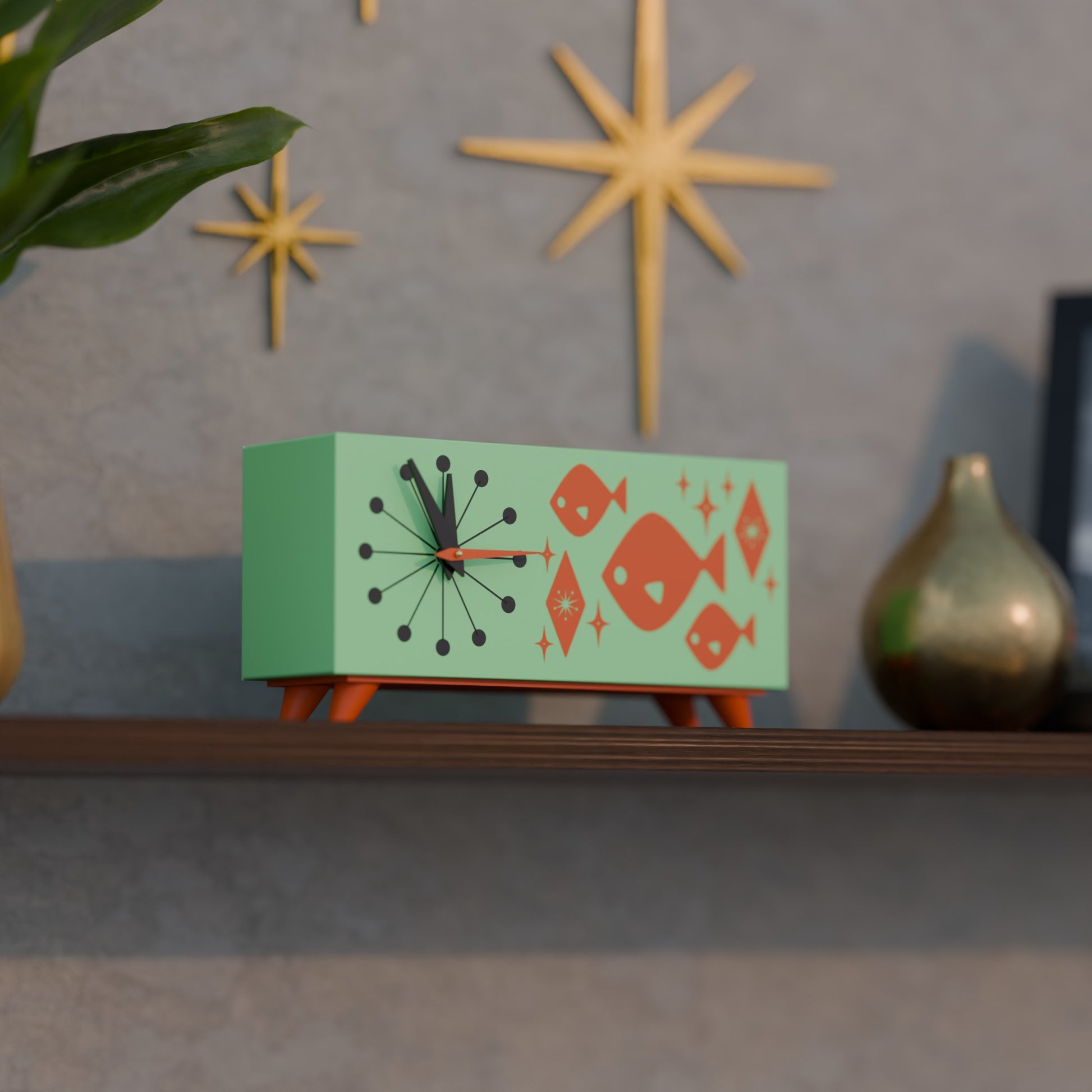 🎨 Design: Mid-century inspired atomic fish graphics with starburst clock detail
