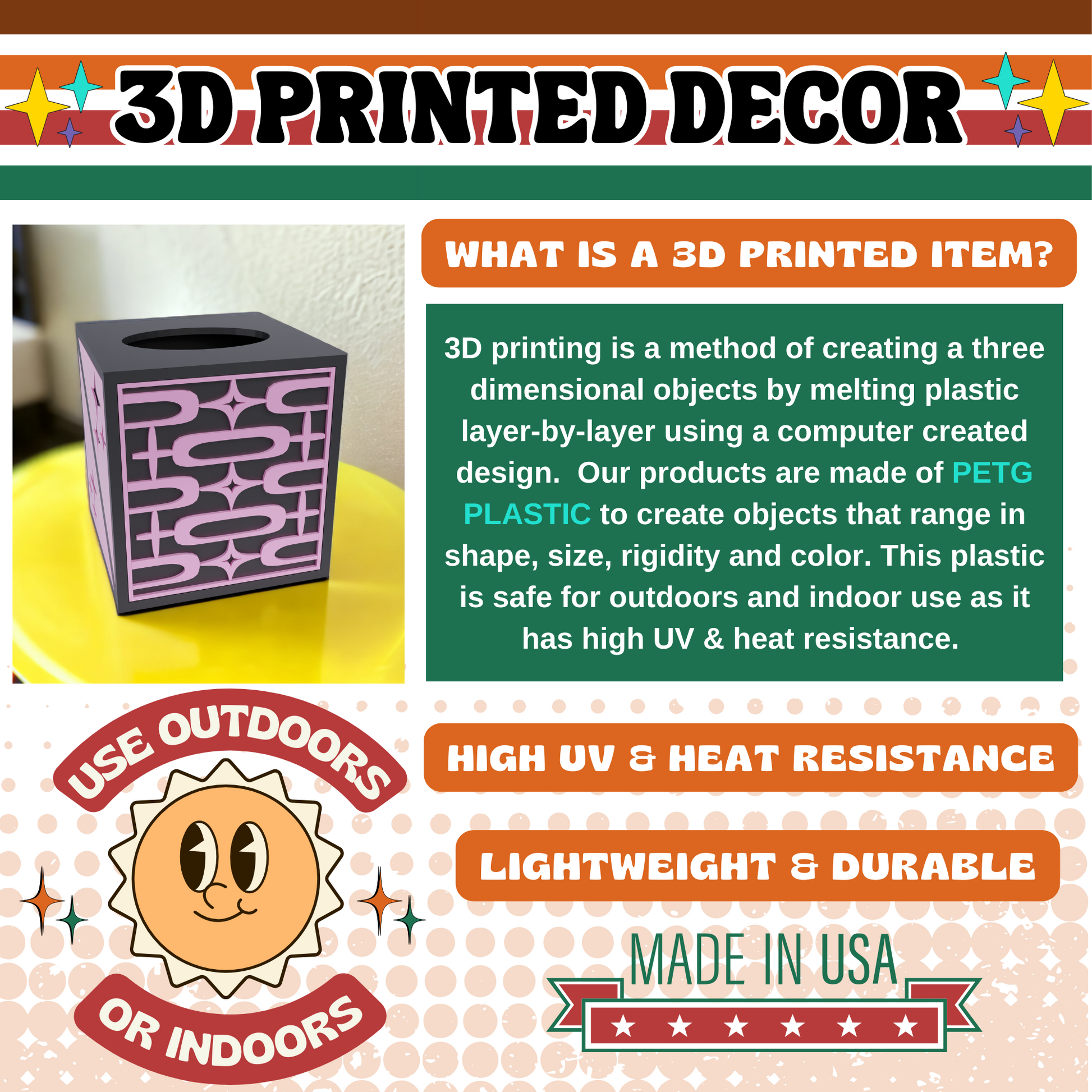 But wait, there's more! We're committed to sustainability, so you can enjoy this tissue box cover guilt-free. Our products are made from high quality PETG thermoplastic. They effortlessly adapt to indoor and outdoor settings with remarkable versatility. The materials we use ensure durability, high temperature resistance, and UV protection, making it perfect for any setting indoors our outdoors. Select from playful retro-inspired shades to seamlessly complement various decor styles.