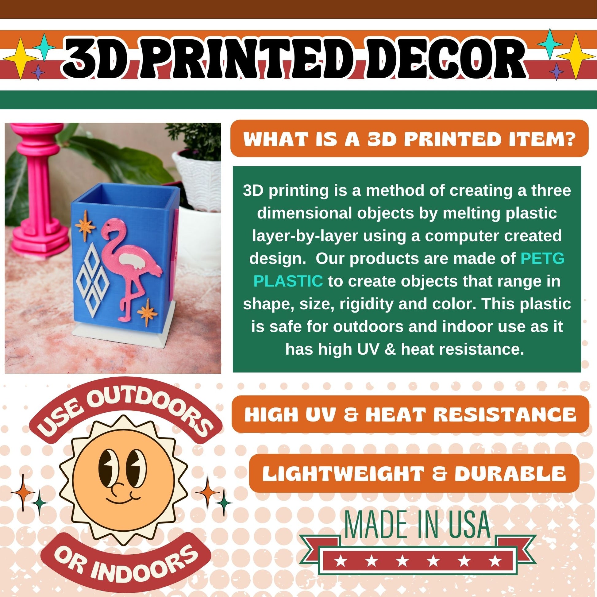 Our products are made from high quality PETG thermoplastic. They effortlessly adapt to indoor and outdoor settings with remarkable versatility. The materials we use ensure durability, high temperature resistance, and UV protection, making it perfect for any setting indoors our outdoors. Select from playful retro-inspired shades to seamlessly complement various decor styles.