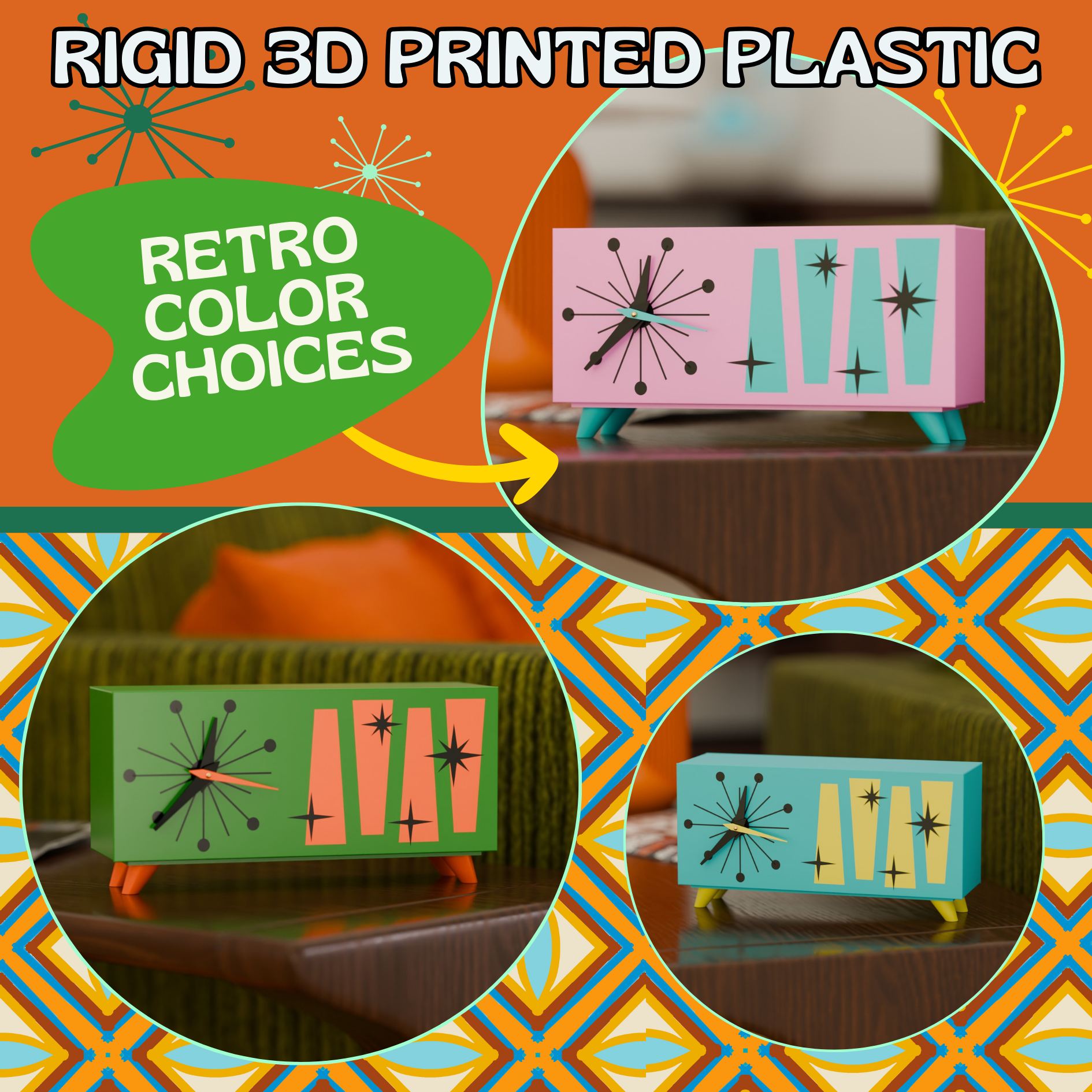 Customize Your Retro Look! Choose your perfect combination of base and accent colors to seamlessly match your mid-century modern or space-age décor.