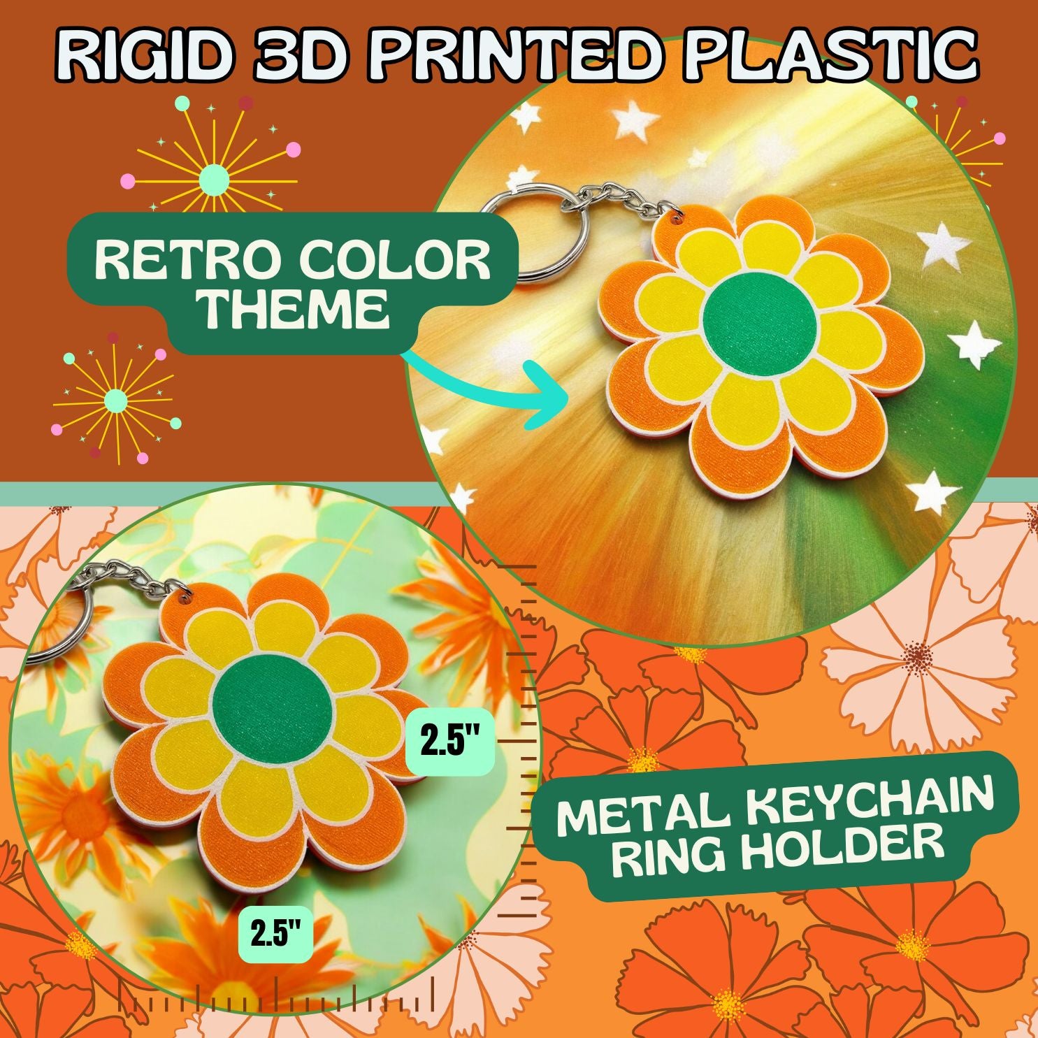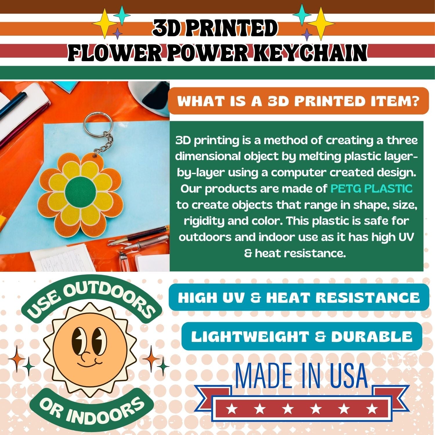 Crafted with care in the USA, this keychain is 3D printed from durable PETG plastic, making it lightweight yet tough—built to withstand daily use while maintaining its retro charm. Includes sturdy metal keyring and chain for easy attachment. The bright, eye-catching colors make it a fun statement piece, great for adding a touch of nostalgic 70s flair to your everyday essentials.