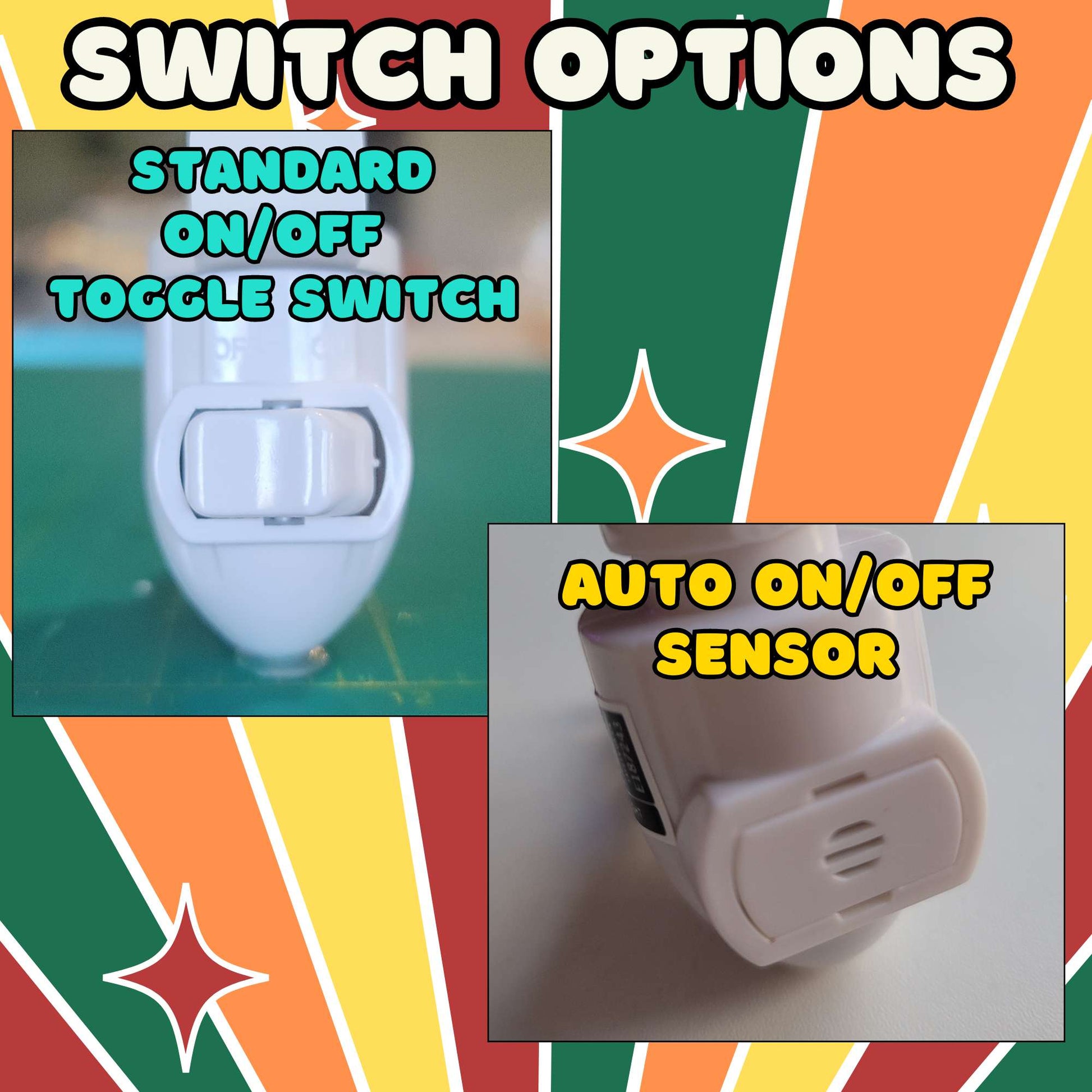 Enjoy the choice between the cool allure of LED or the cozy warmth of traditional bulbs. A simple flip switch at the front grants easy access for turning your night light on and off at your leisure.