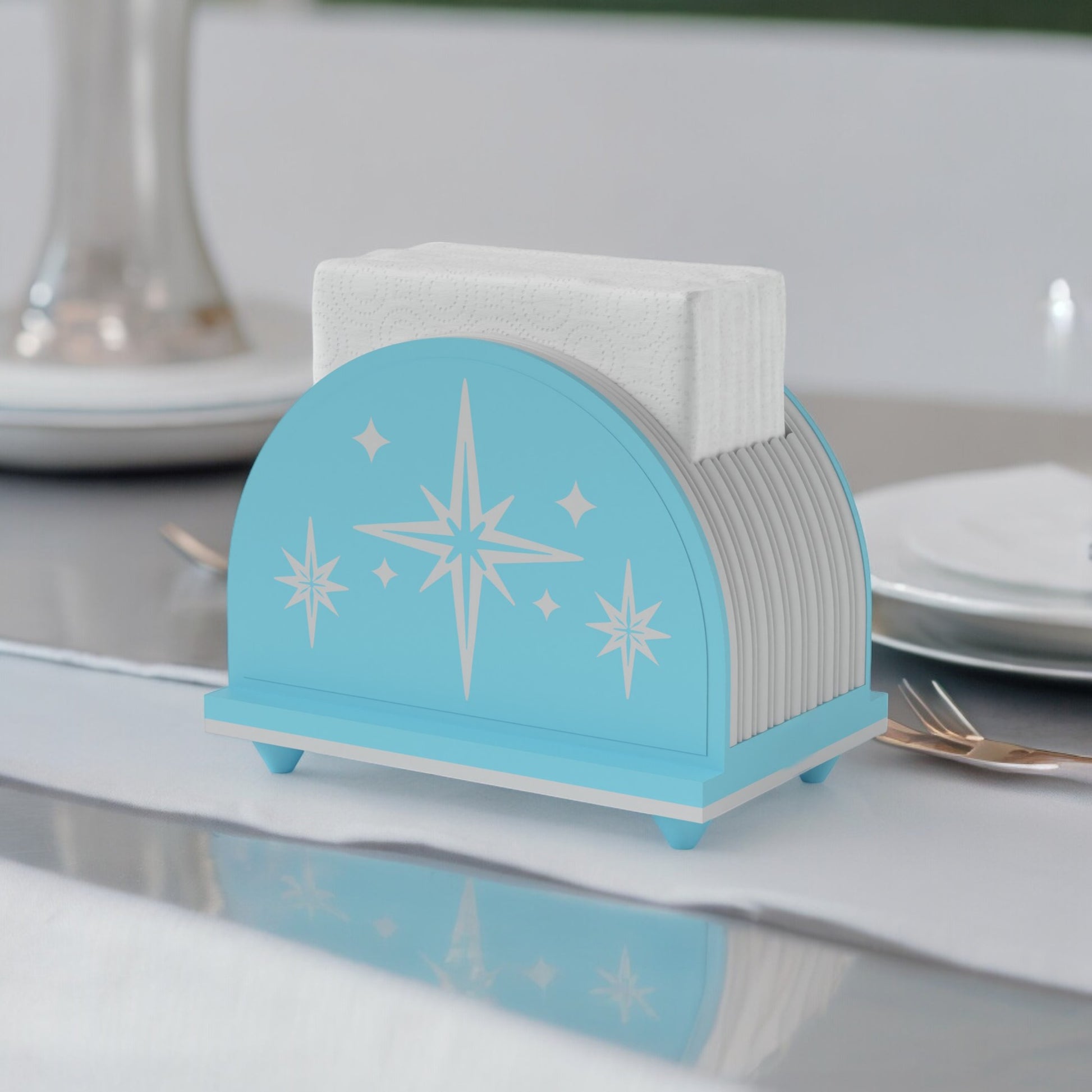 Step back into the chic era of the 1950s with our newest creation: the Mod Arc Starburst Napkin Holder!
