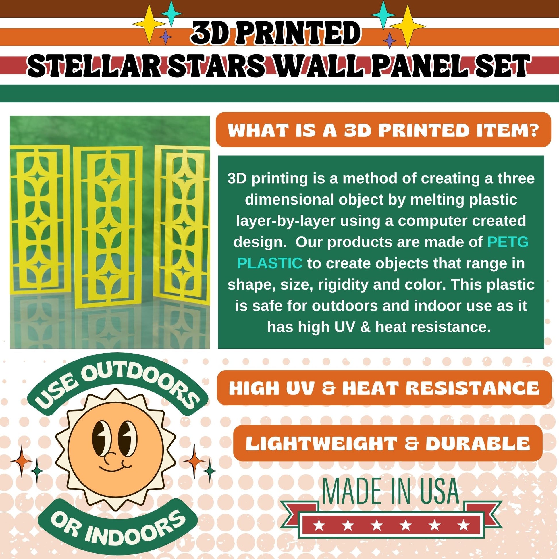 Each panel is meticulously crafted from premium PETG thermoplastic using cutting-edge 3D printing technology. Our panels are not only visually stunning but also highly durable, heat resistant, and UV protected, making them perfect for long-lasting indoor and outdoor use. Choose from a range of vibrant, retro-inspired colors to perfectly complement your unique decor style.