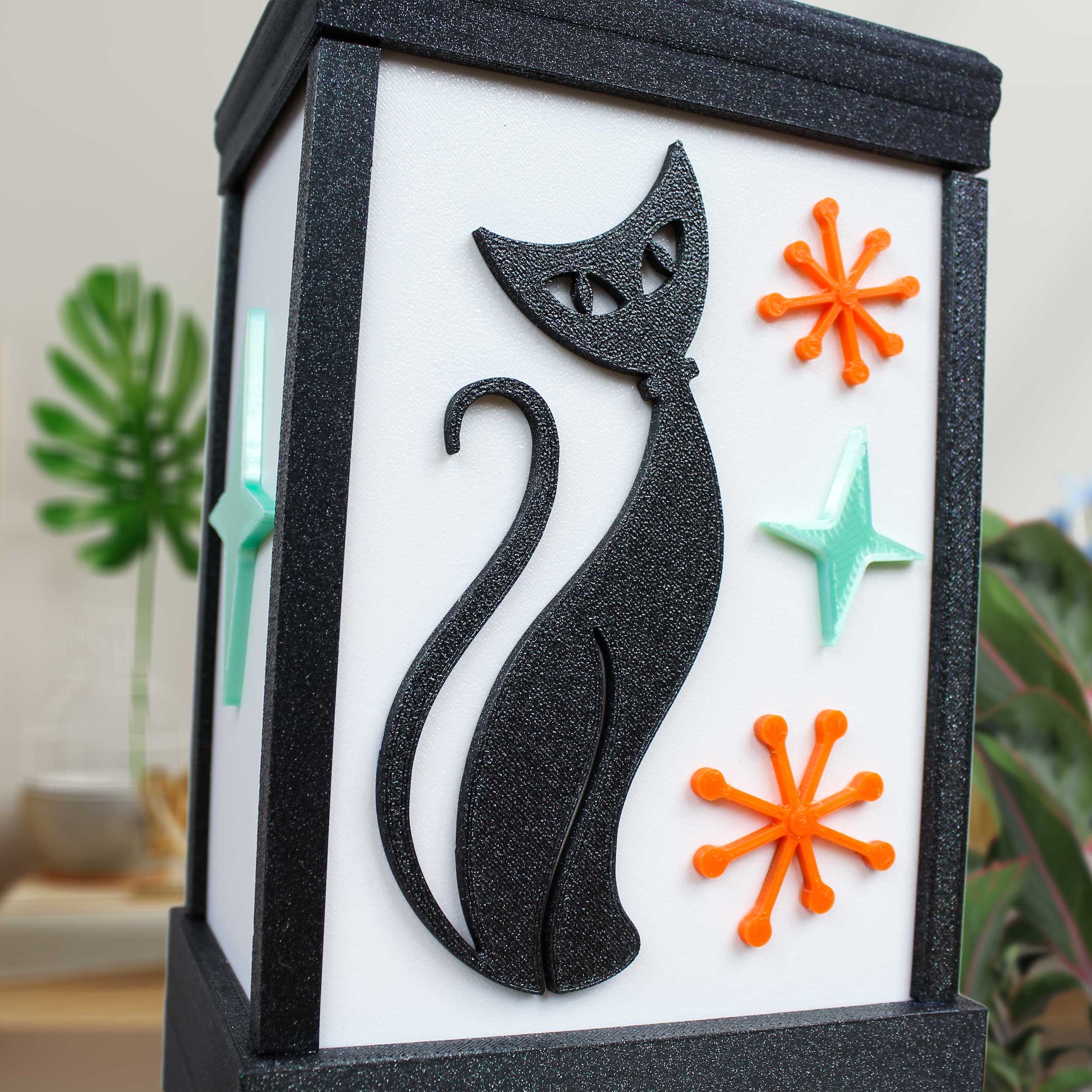 Looking to add some personality and style to your home? Look no further than the Atomic Cat Lamp! This 3D printed, eco-friendly lamp is the perfect blend of functionality and flair. Its midcentury modern design will add a touch of sophistication to any space. Plus, the included dimmer switch makes it easy to go from a soft, warm glow to a bright, energizing light in a snap. Not only is the Atomic Cat Lamp a conversation starter, it's also energy efficient. So go ahead, light up your life with the Atomic Cat Lamp! We used our special black glitter material to give it a shimmer and retro look, along with mint and orange accents.