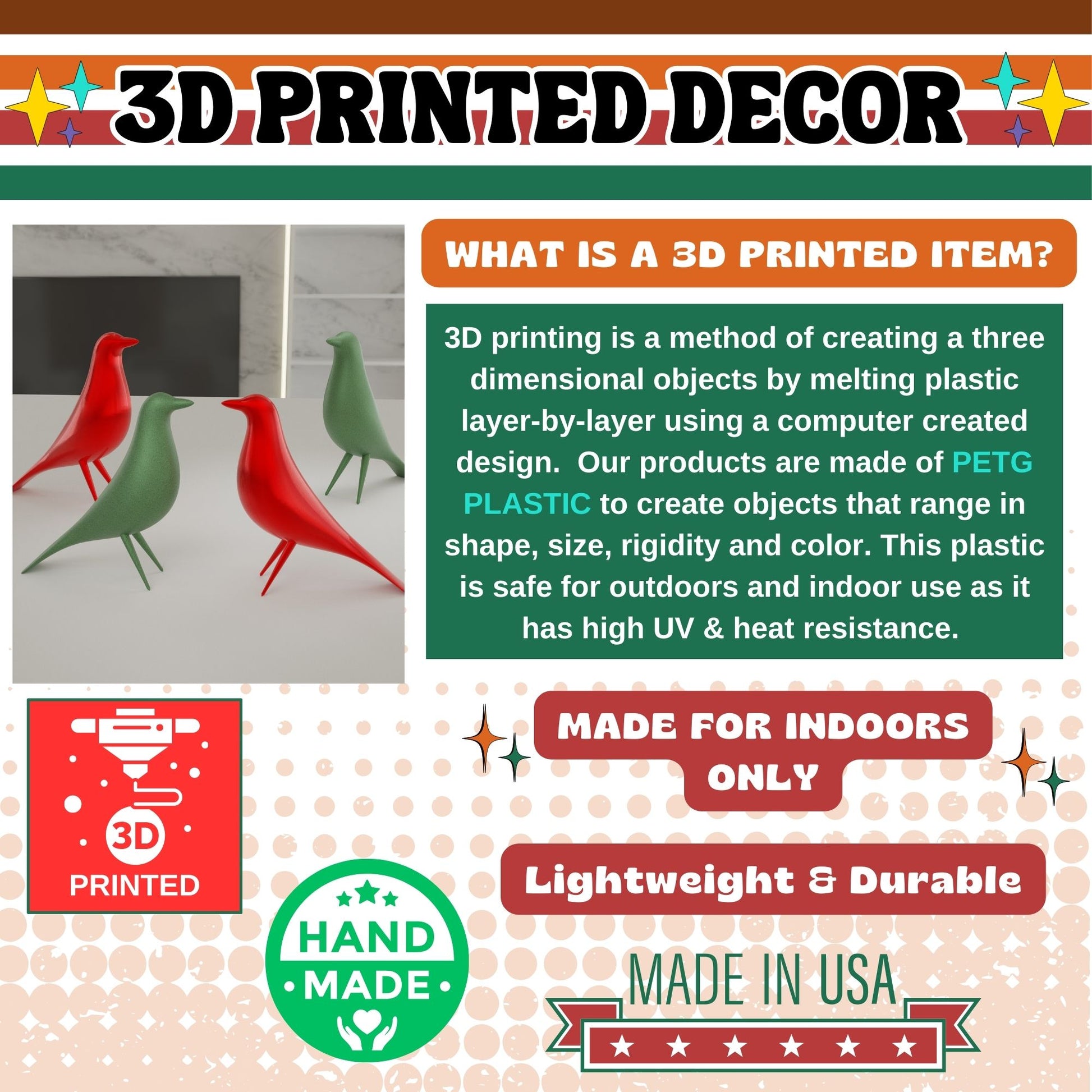 These are made of PLA thermoplastic, Lightweight yet durable. Includes a set of 2 or 4 birds one of each color in large and small.