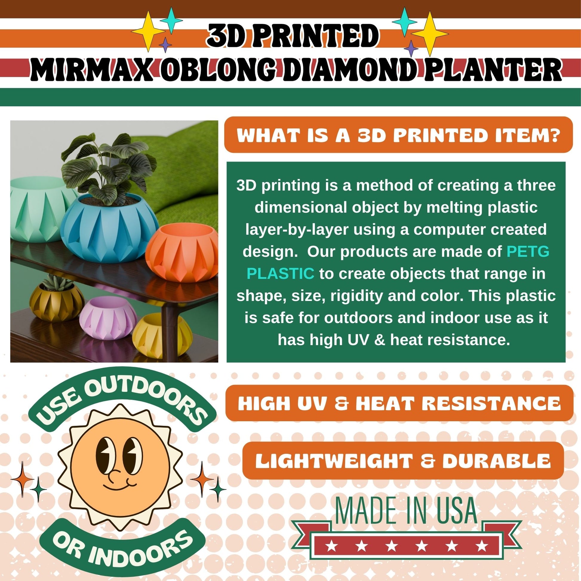 Step into a modern retro world with our vintage-styled Mirax Oblong Diamond Planter! This uniquely designed, 3D-printed beauty is truly one-of-a-kind. Unlike other sellers who cut corners with cheap PLA, we use top-notch PETG plastic. It's perfect for both indoor and outdoor use, boasting high UV and heat tolerance.