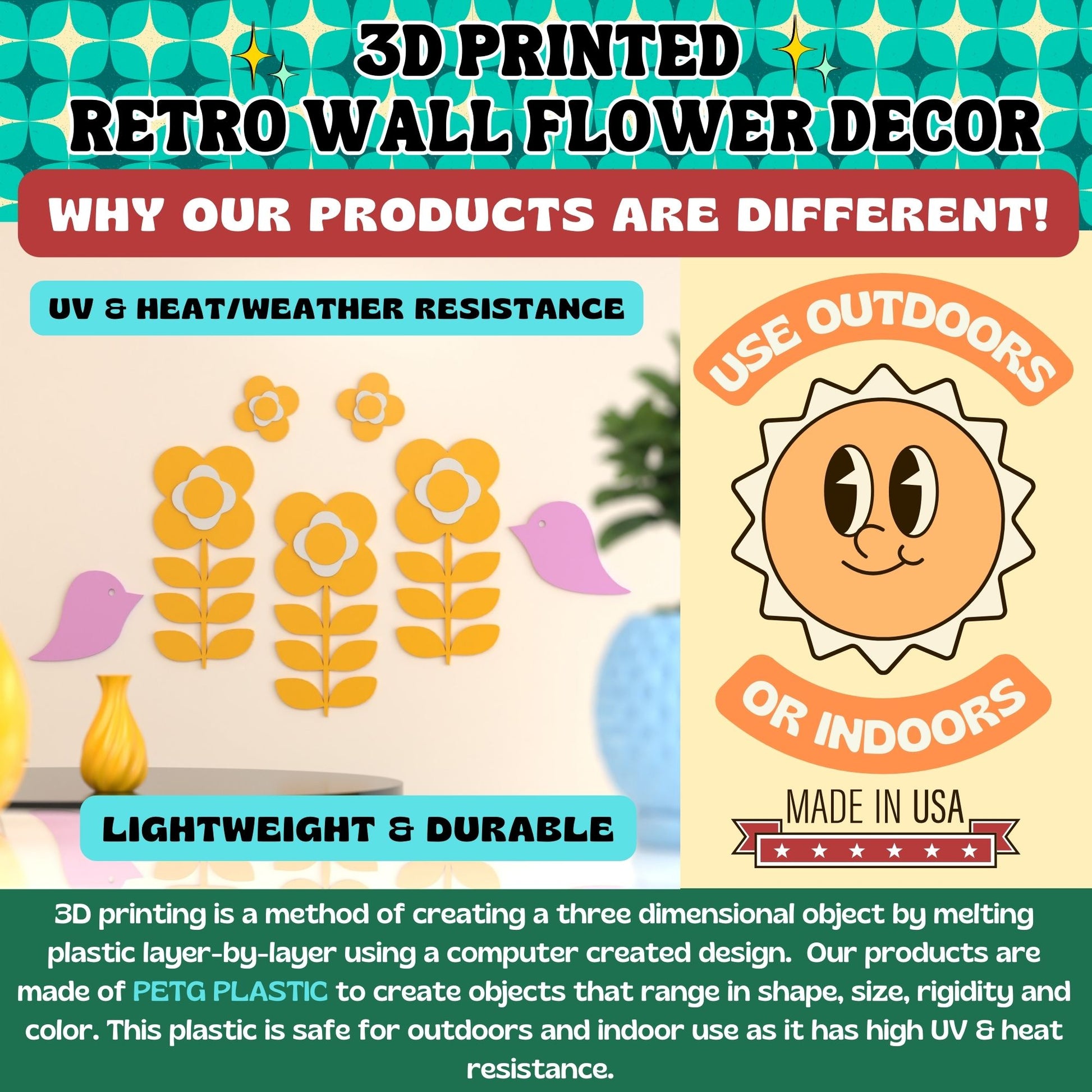 Bring a touch of playful nostalgia to your walls with our Retro Flower Power Wall Decor Set – inspired by bold 1970s design. Featuring oversized blooms and charming retro birds, this set is perfect for adding a vibrant mid-century modern accent to any room.