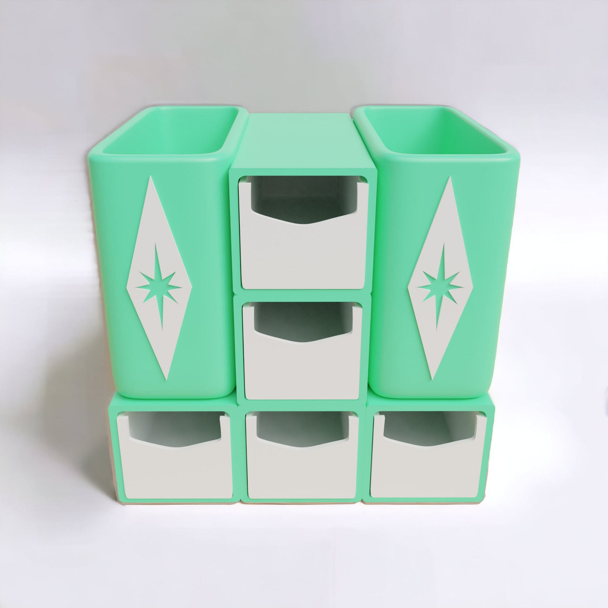 Our desk caddy also includes five sliding compartments, offering convenient storage for smaller items. The diamond starburst on each side adds a touch of elegance, making it a perfect fit for any Midcentury Modern décor.