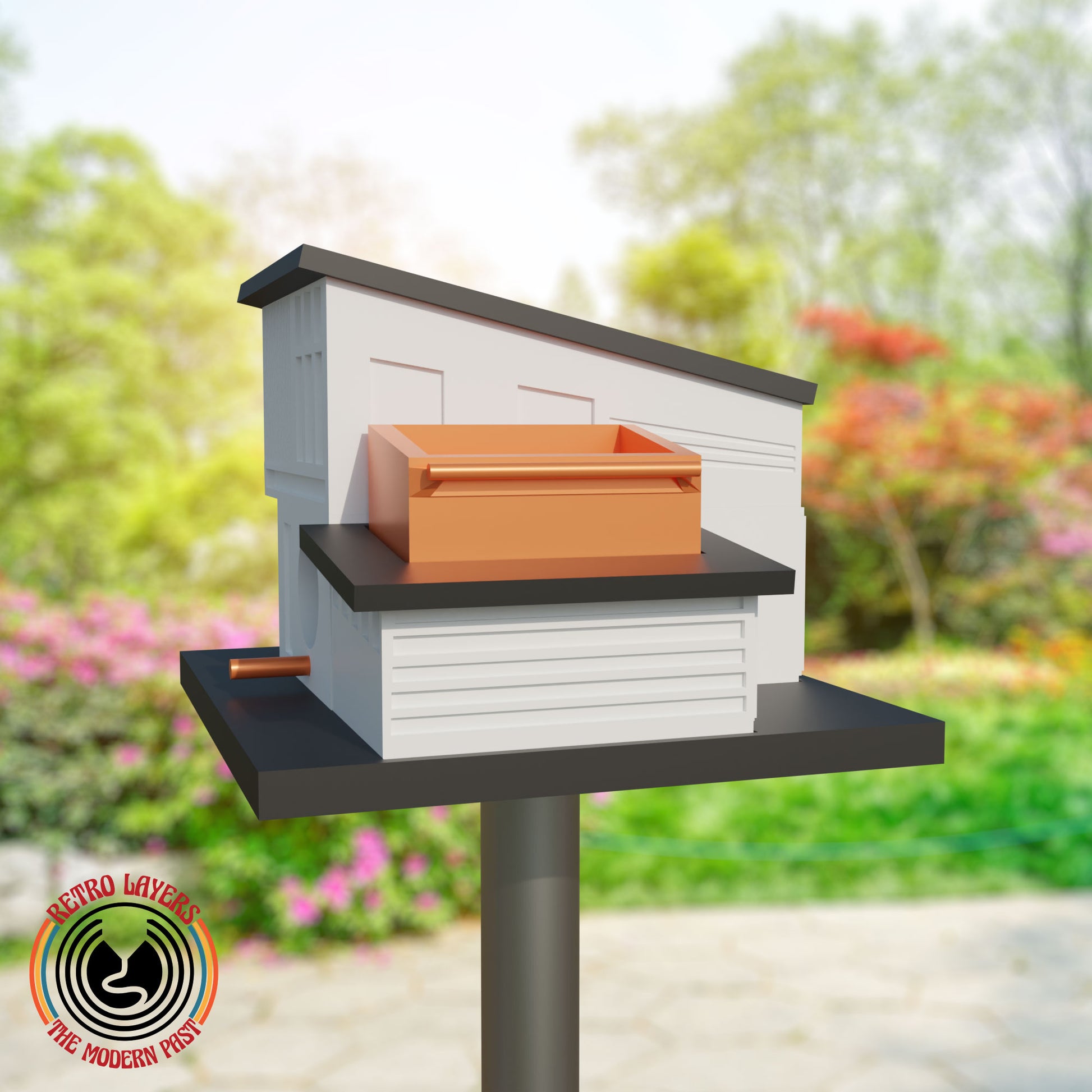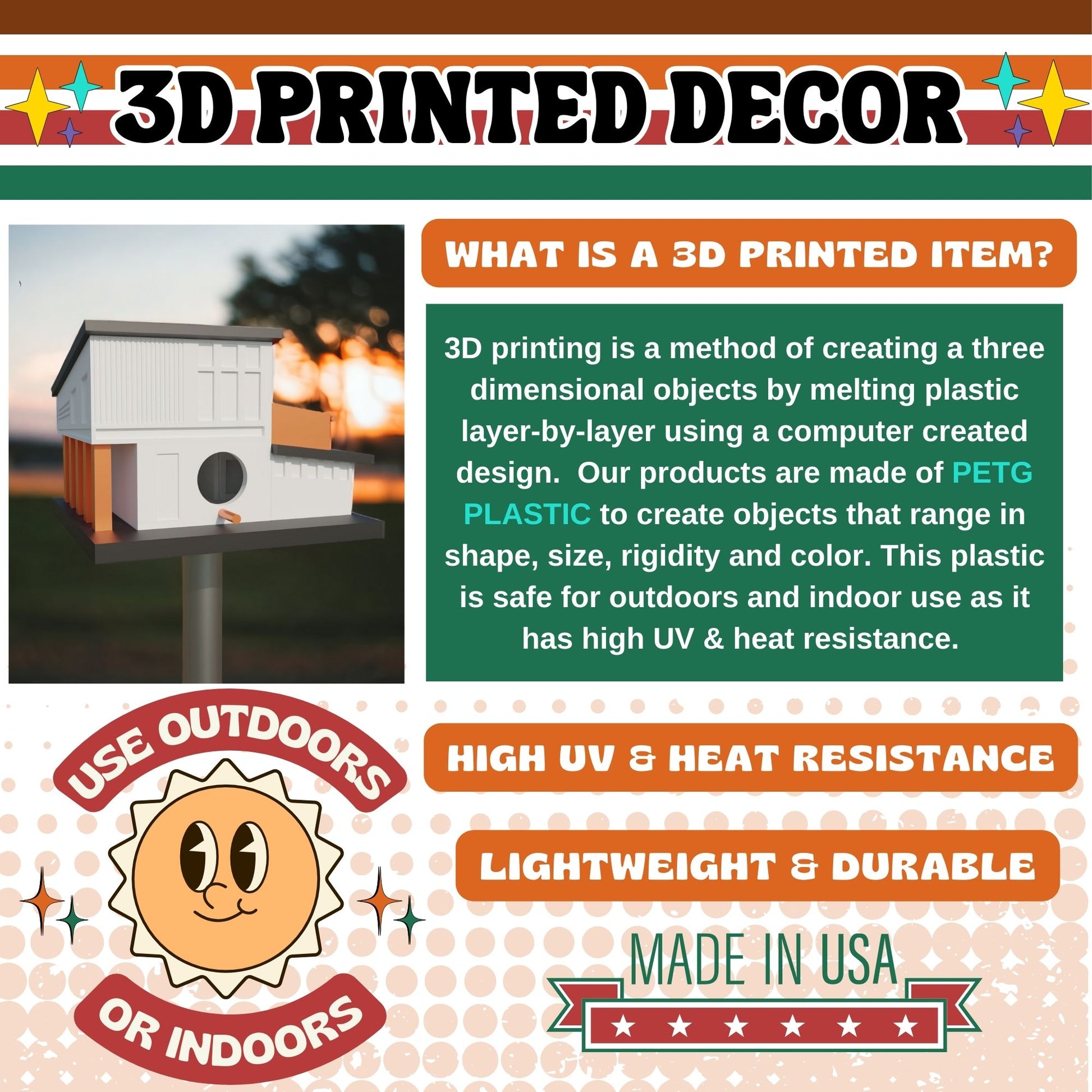 Welcome to the mid century modern birdhouse! This product is made in the USA with high quality materials and craftsmanship so that you can enjoy it for years to come. It's thermoplastic (3d Printed) so it is durable and somewhat lightweight. These will withstand all kinds of weather conditions; plus you can choose from multiple color schemes!