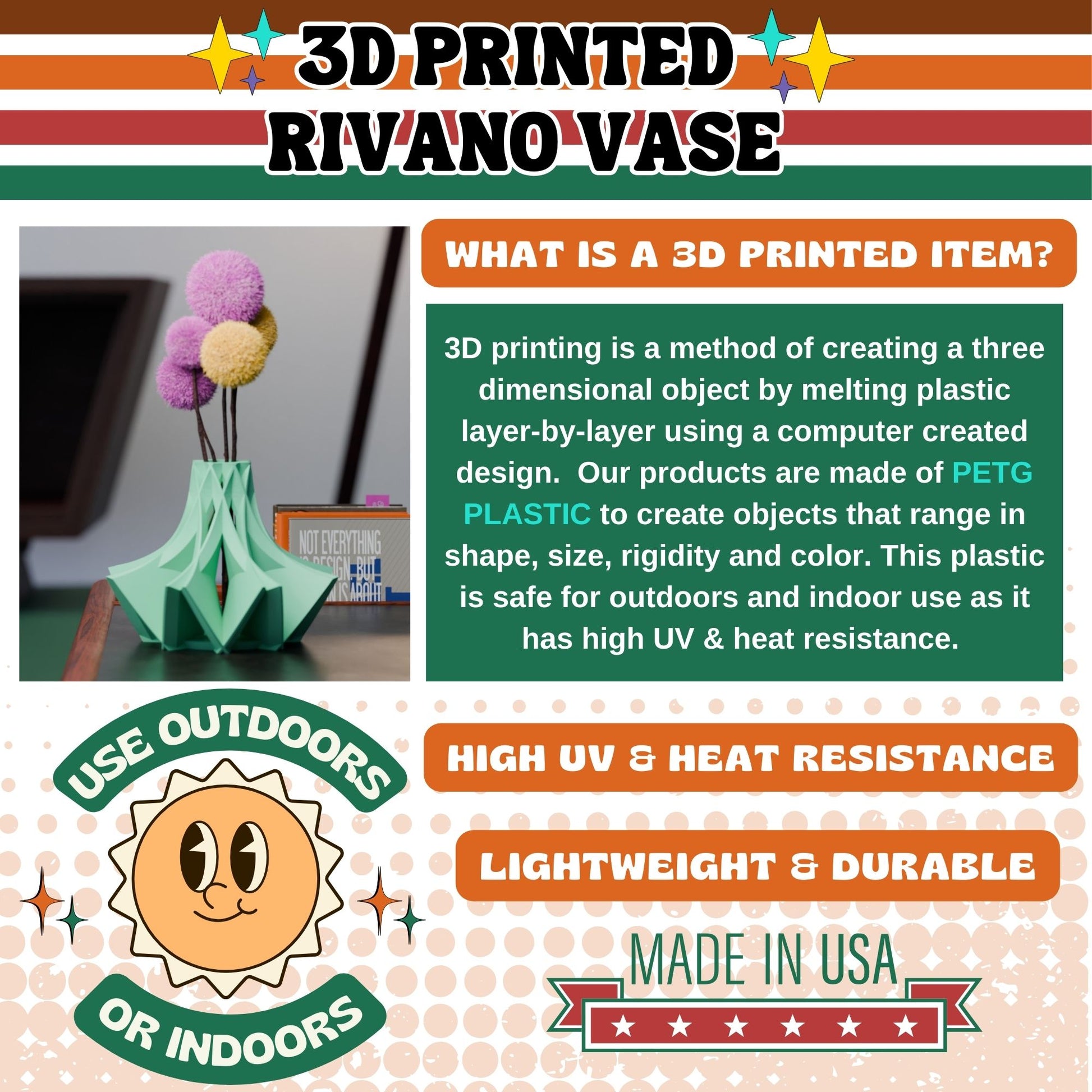Step into a modern retro world with our vintage-styled Rivano Vase! This uniquely designed, 3D-printed beauty is truly one-of-a-kind. Unlike traditional vases, the Rivano Vase features open sides, making it ideal for displaying dried or artificial flowers.