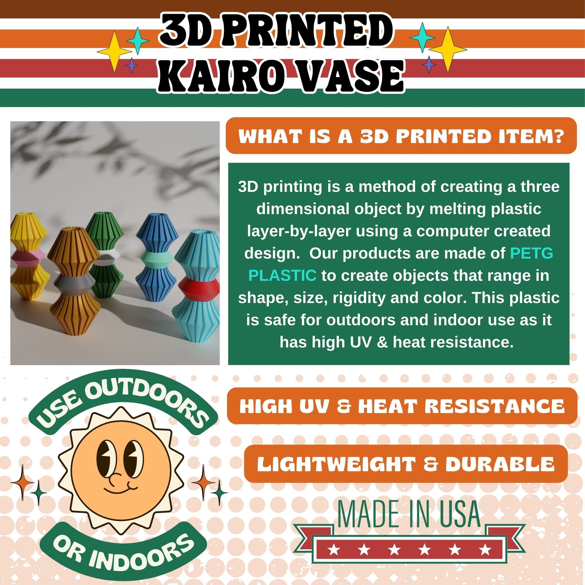 Step into a modern retro world with our vintage-styled Kairo Vase! This uniquely designed, 3D-printed beauty is truly one-of-a-kind. Unlike traditional vases, the Kairo Vase is watertight making it perfect for both fresh or artificial flowers or plants.