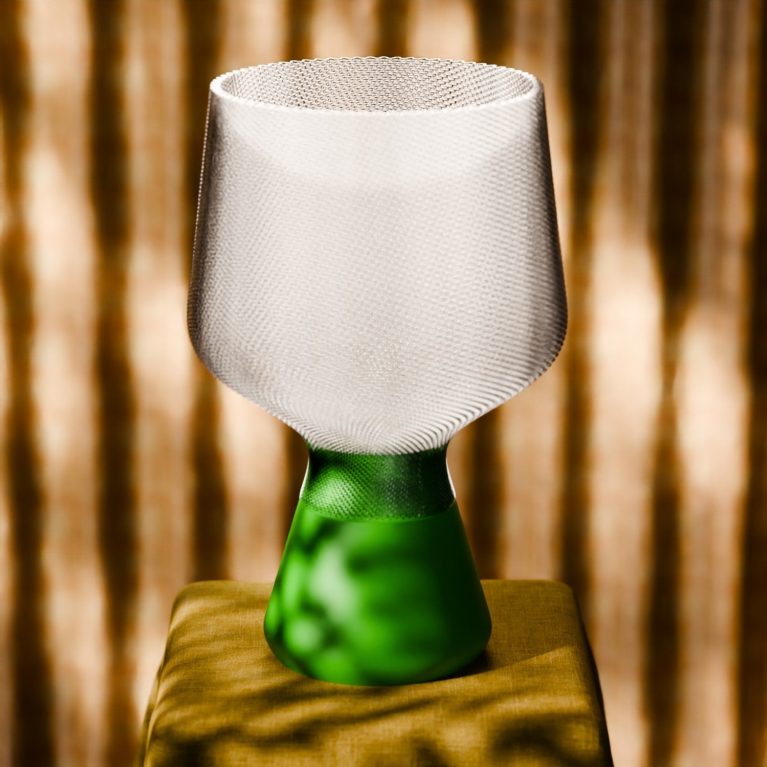 Design: Semi-transparent mesh bulbous shade sitting on a sleek, tapered base.