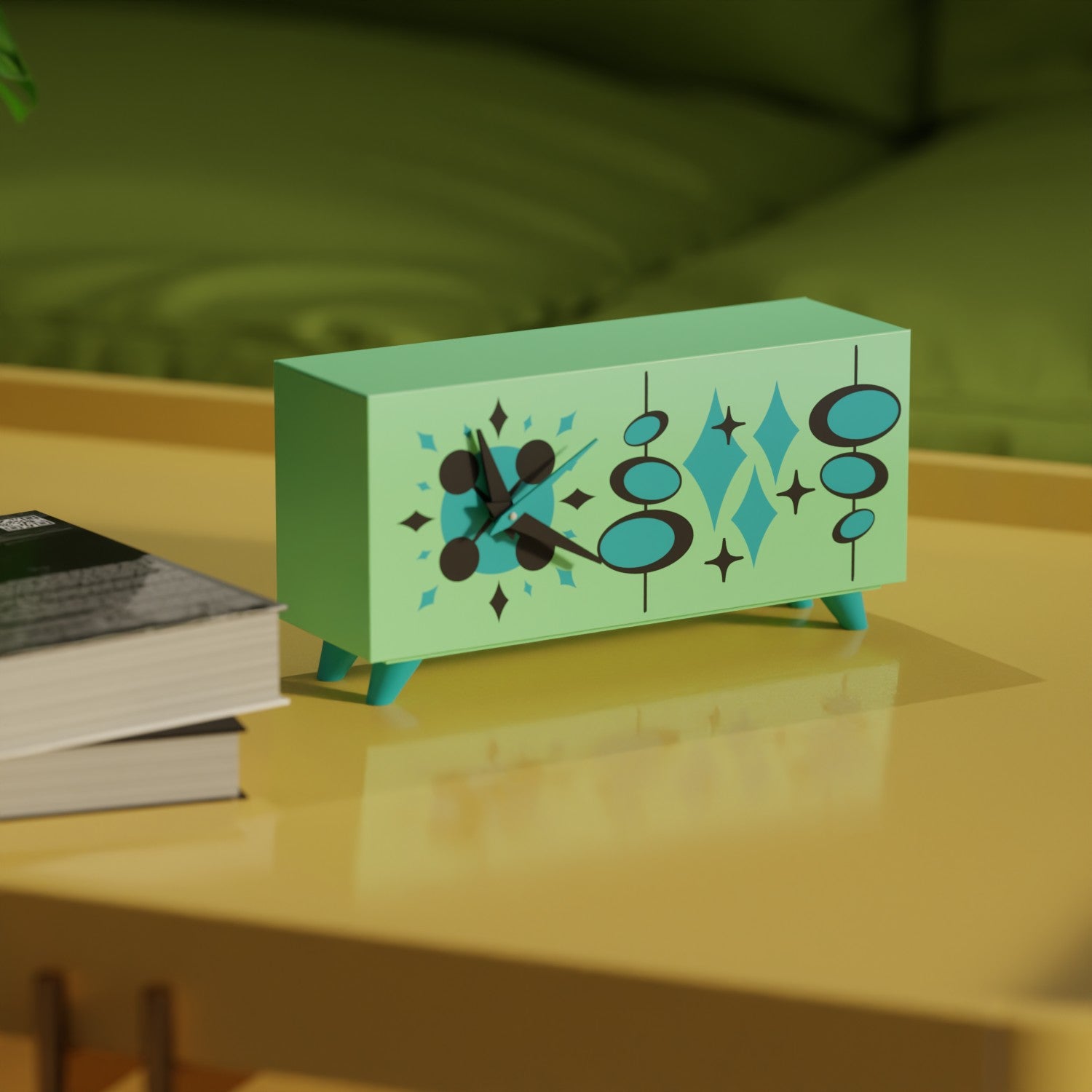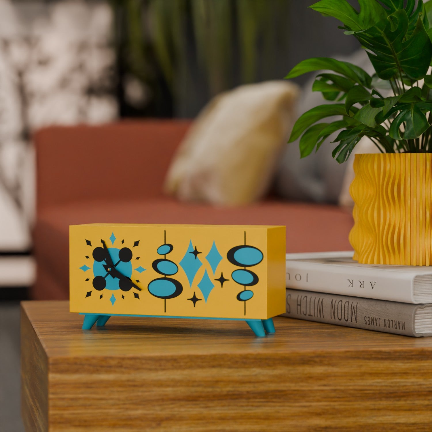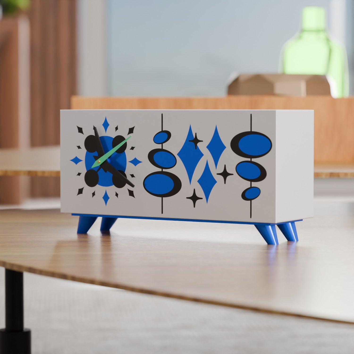 Mid-Century Modern Elegance with a Futuristic TwistThe Sputnik Diamonds Desk Clock features a distinctive magnetic diamond-patterned cover that adds a sculptural statement while allowing effortless access to the clock mechanism. Supported by sleek, angled atomic-style legs, this clock captures the essence of retro futurism and serves as a standout piece in any room.