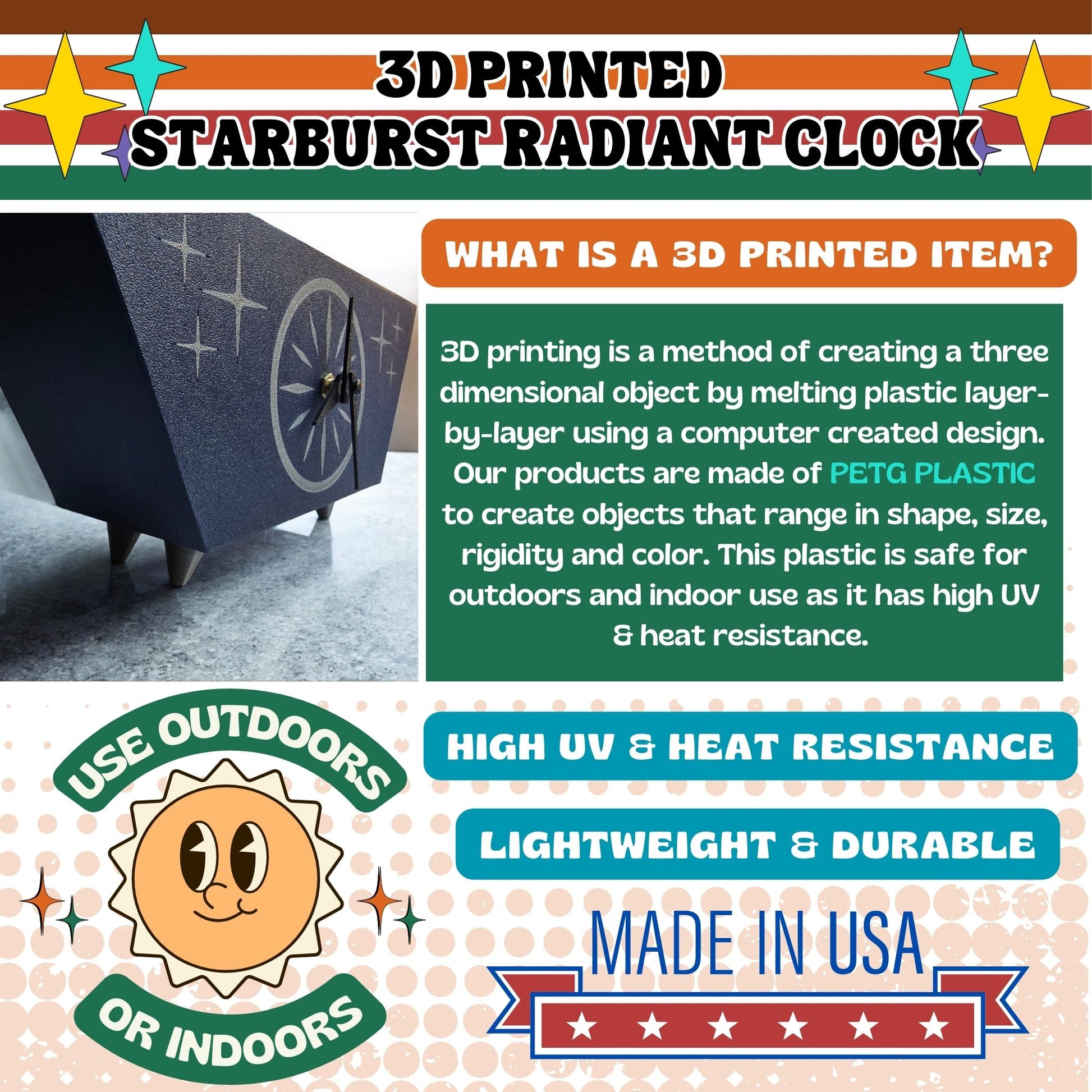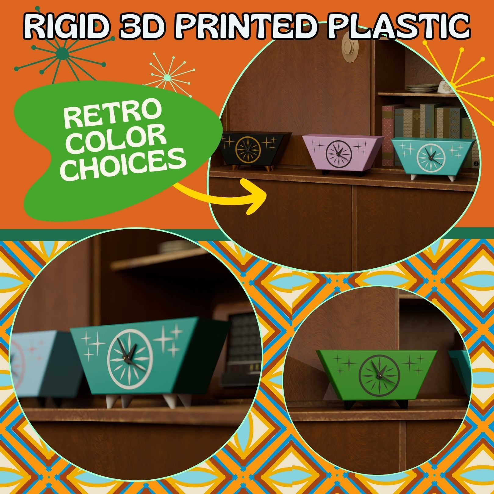 ✨ Handcrafted in the USA from durable PETG plastic, this clock is available in a variety of vibrant, vintage-inspired color combos, so you can match it to your MCM decor or mix things up with a pop of retro flair!