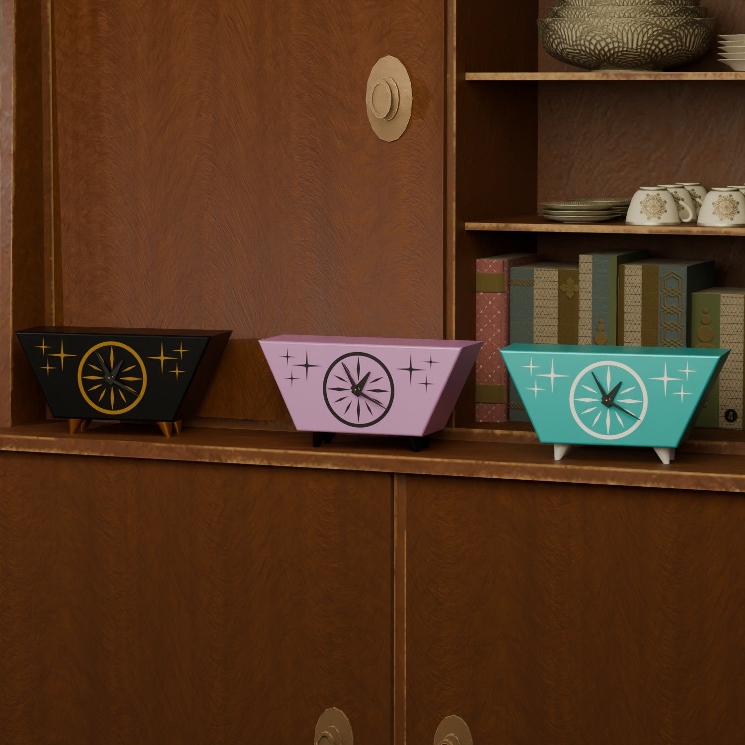 Bring the bold, space-age charm of the 1960s into your home with the Starburst Radiant Desk Clock! This mid-century modern masterpiece features an eye-catching starburst design that radiates pure retro energy. Whether you're decking out your Eames-era office, space-age lounge, or atomic ranch, this clock is the perfect functional statement piece.