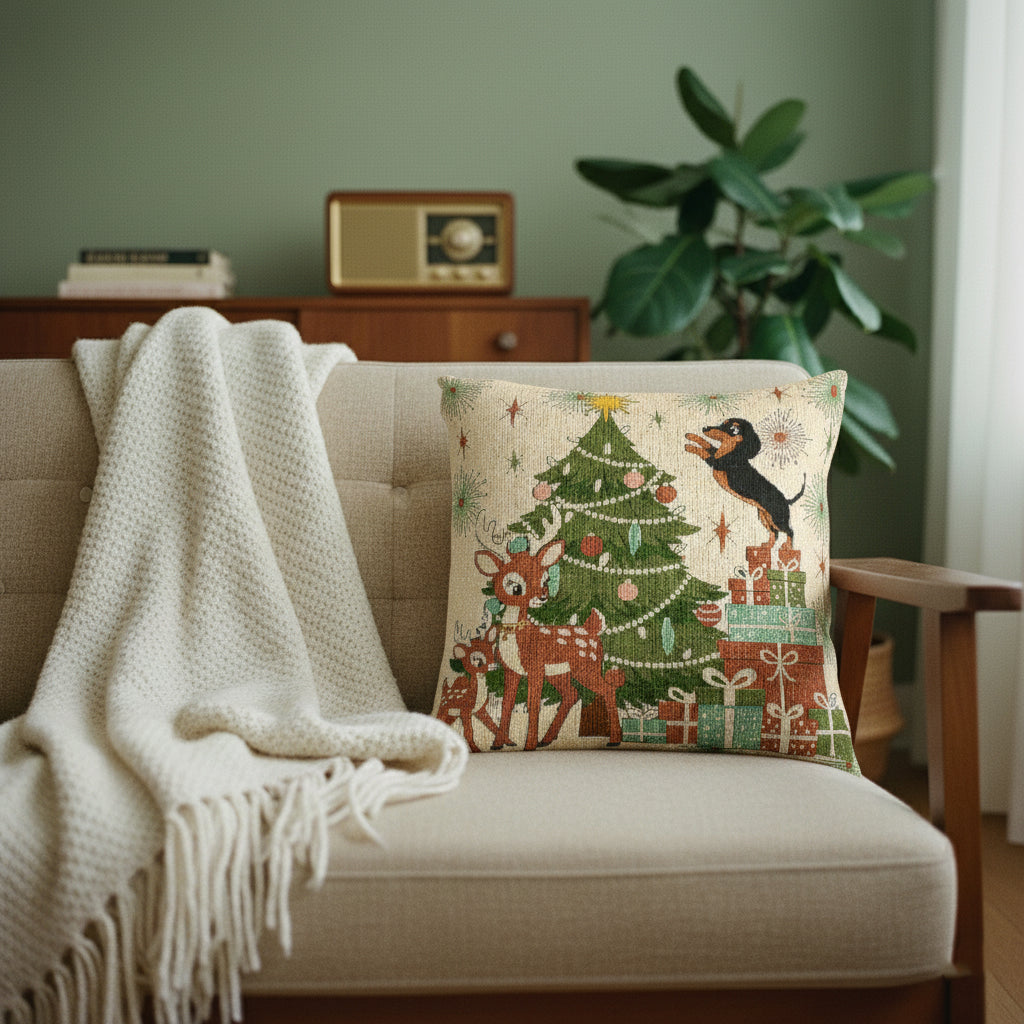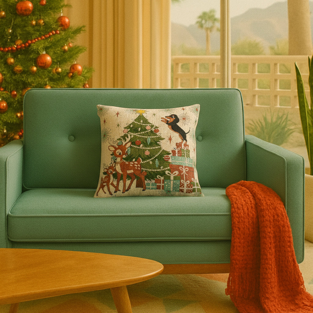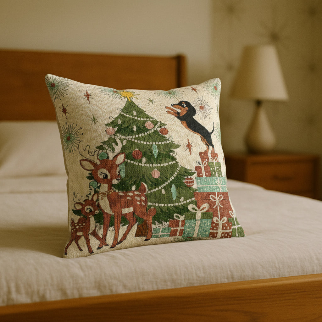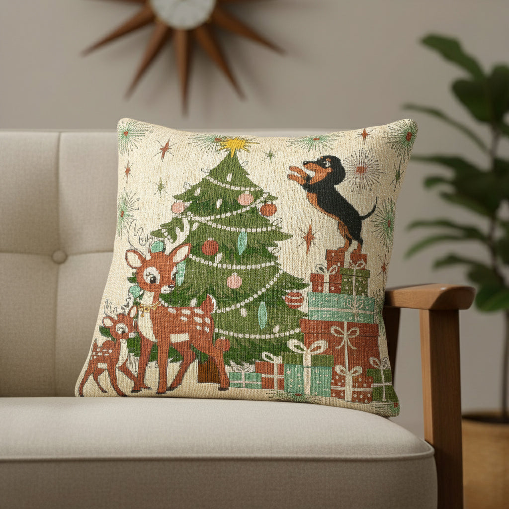 Celebrate Christmas the vintage way with tinsel trees, glittering starbursts, and one very determined dachshund on a mission to top the tree. This retro woven throw pillow features a classic mid-century holiday scene: a sweet mama and baby reindeer, a long-bodied dachshund balancing on presents to place the star, and a Christmas tree wrapped in atomic-era charm.