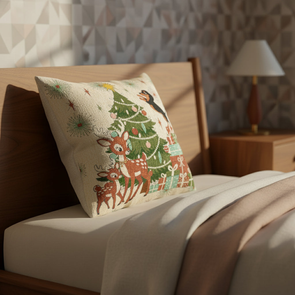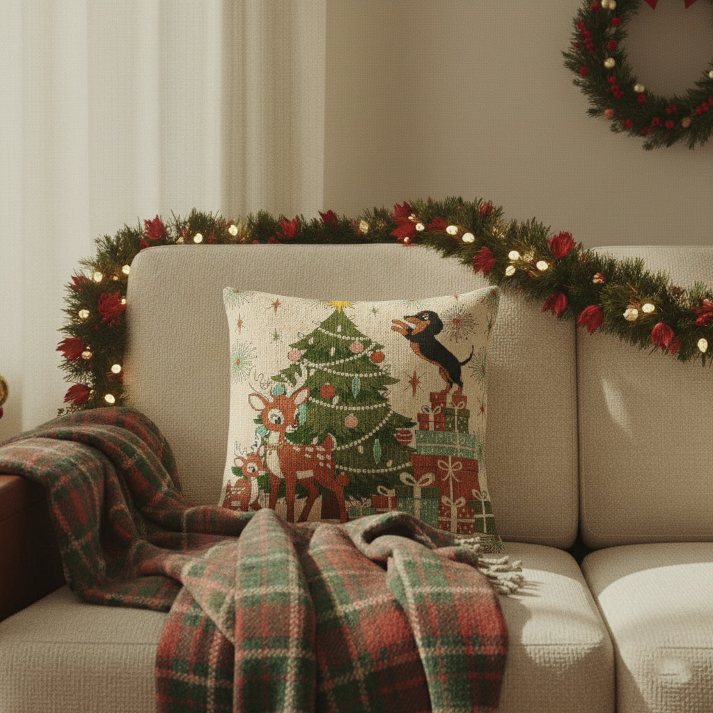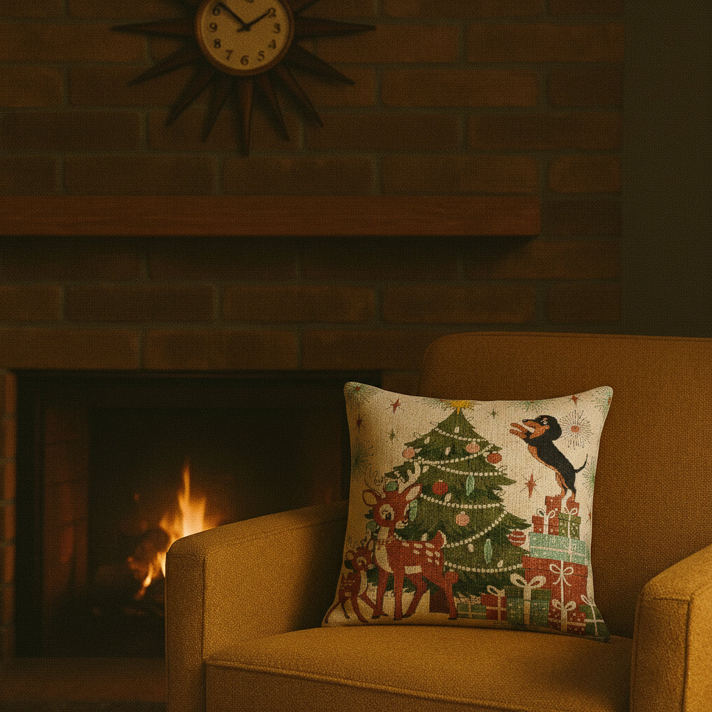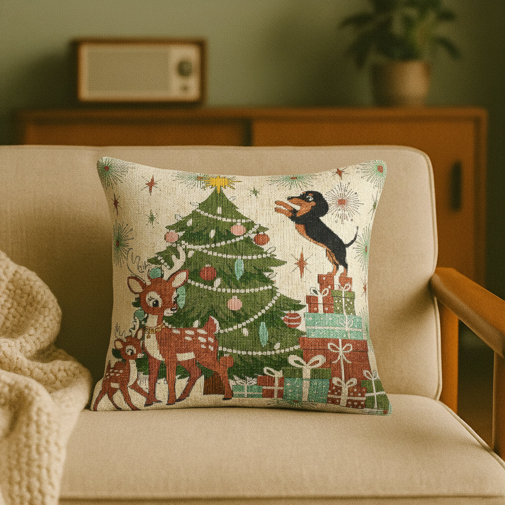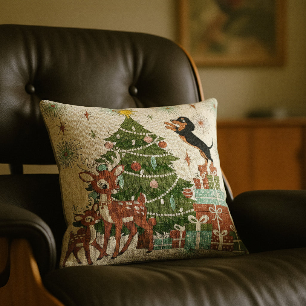 Celebrate Christmas the vintage way with tinsel trees, glittering starbursts, and one very determined dachshund on a mission to top the tree. This retro woven throw pillow features a classic mid-century holiday scene: a sweet mama and baby reindeer, a long-bodied dachshund balancing on presents to place the star, and a Christmas tree wrapped in atomic-era charm.